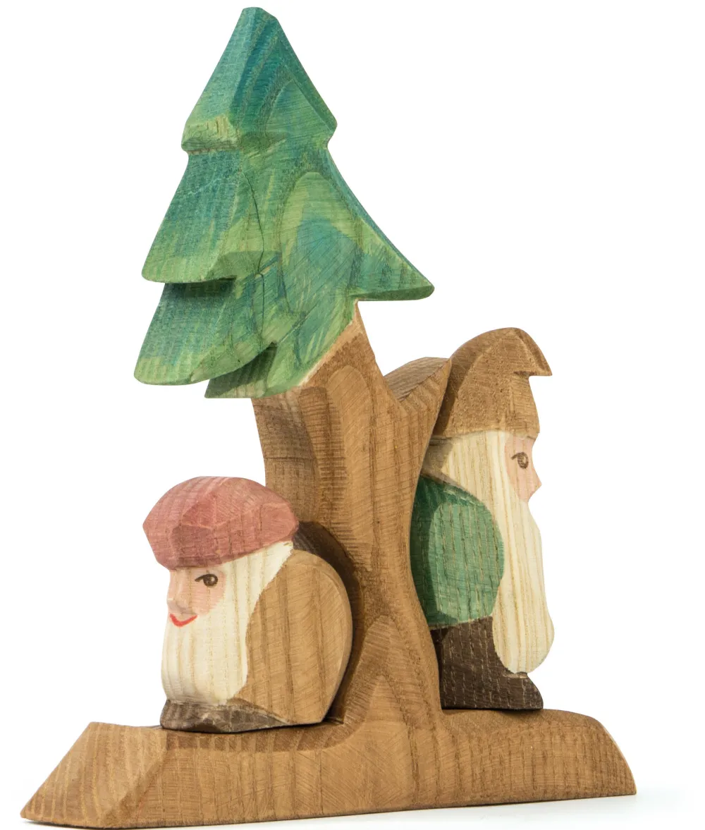Dit is de complete set bestaande uit 2 dwergen en een Tannenbaum, veelal dennenboom genoemd maar eigenlijk is het een spar. De set van Ostheimer is van inheems geteeld hout met de hand gemaakt. Hoogte: 15.5 cm.