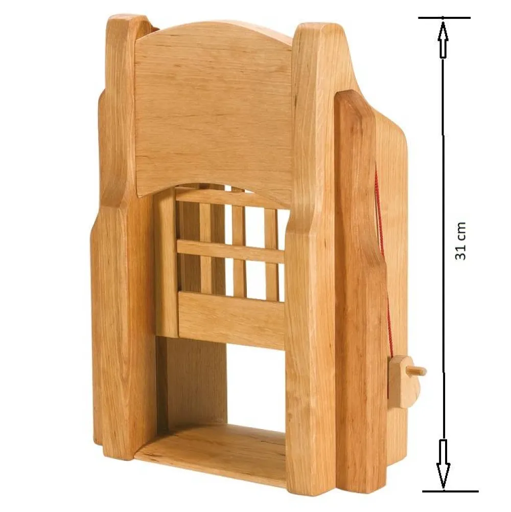 Ook deze poort kun je naar beneden laten zakken door middel van het opwindkatrol aan de zijkant van de poort. Wil je de poort open houden dan kun je deze vastzetten met de houten rem aan de achterkant van de poort. Laat je eigen fantasie de vrije loop en maak zo je eigen kasteel of burcht helemaal compleet met diverse figuren en andere toebehoren.