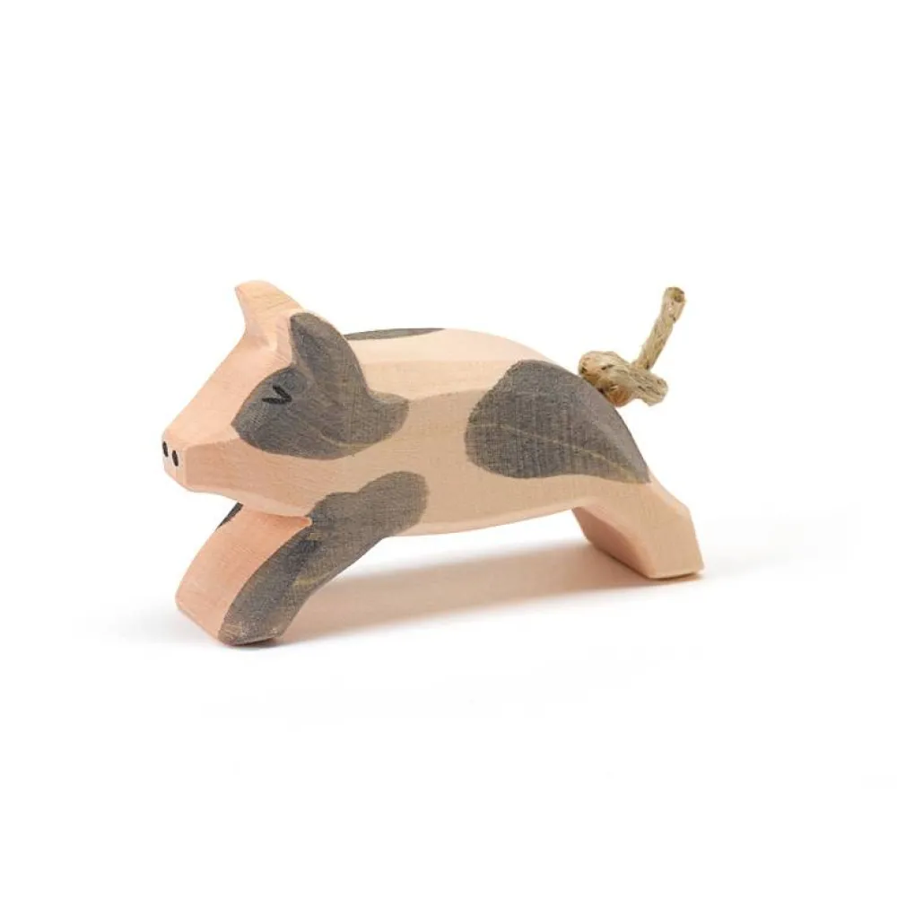 Deze met de hand en uit hout gesneden big komt uit de serie boerderijdieren van Ostheimer. Deze bigis aan het rennenen is gevlekt. Hoogte: 4cm