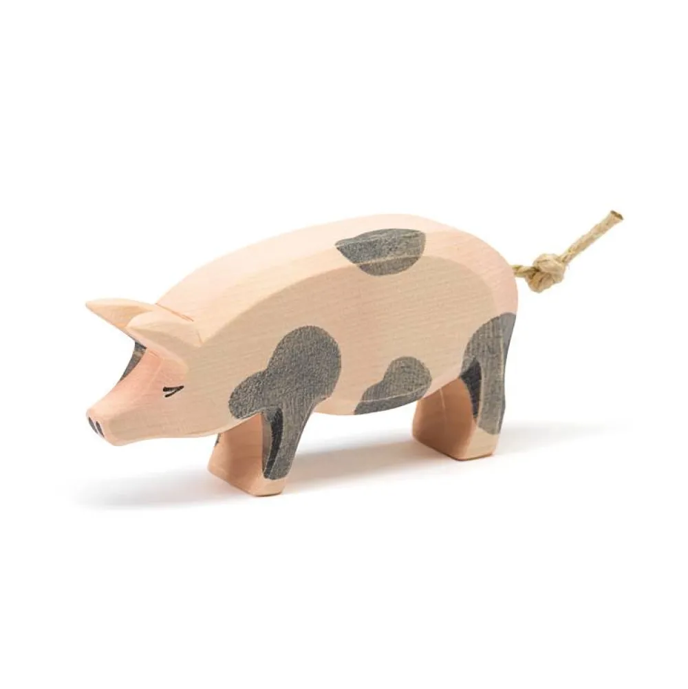Deze met de hand en houtgesneden uit de serie boerderijdieren van Ostheimer is het varken. Dit varken heeft de kop omhoog en is gevlekt. Hoogte: 6cm