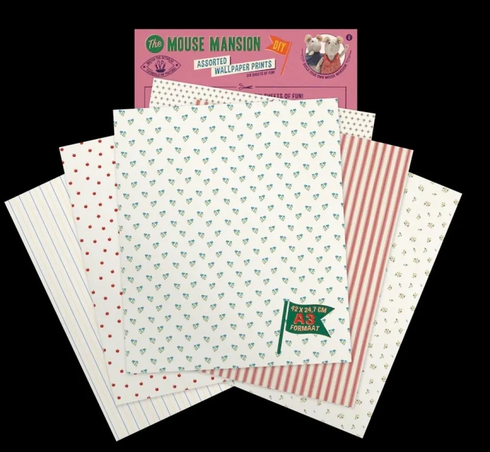 Nu heb je een kartonnen speelhuis, meubels, ramen & deuren, maar waarmee ga je nu de kale muren van jouw Muizenhuis behangen? Uiteraard met deze te gekke behangetjes!