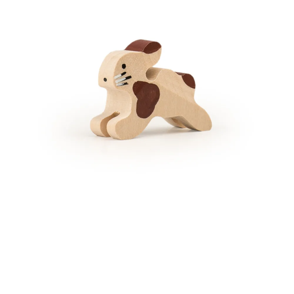 Deze haas van Trauffer heeft een rennende houding en is met de hand gemaakt van lindehout in Zwitserland, de gebruikte verf is vrij van chemicaliën. De haas is robuust genoeg om mee te spelen. Hoogte: 4 cm.