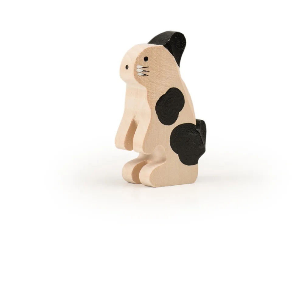 Deze haas van Trauffer staat rechtop en is met de hand gemaakt van lindehout in Zwitserland, de gebruikte verf is vrij van chemicaliën. De haas is robuust genoeg om mee te spelen. Hoogte: 5 cm.