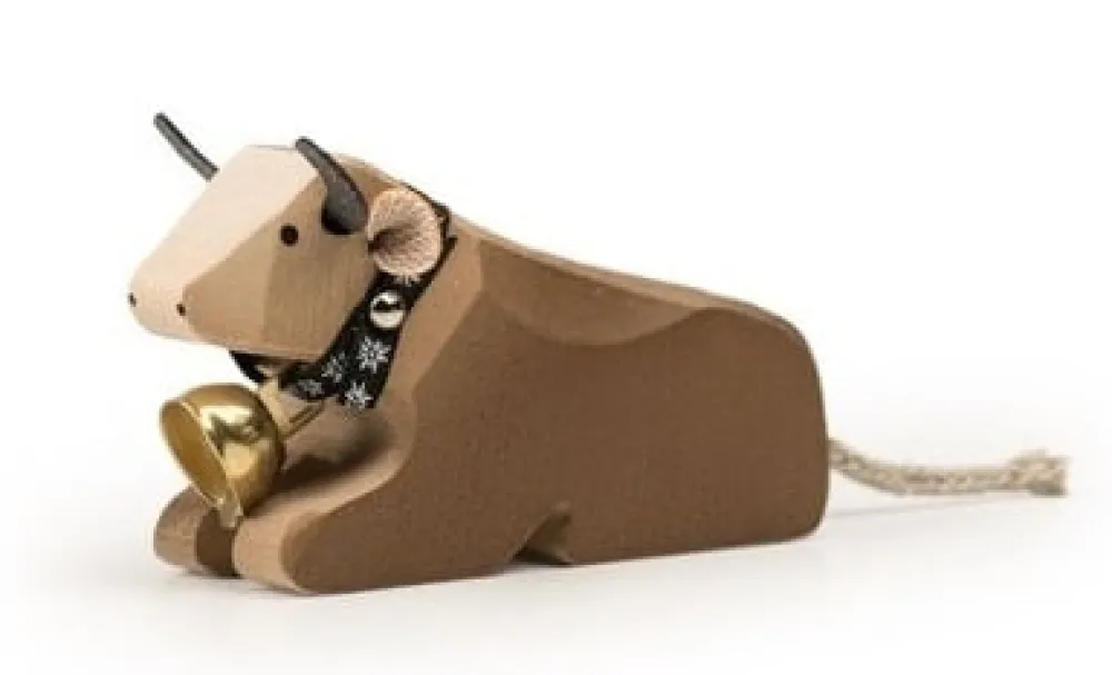 Deze bruine koe nummer 1 van Trauffer ligt en heeft zijn kop omhoog gericht. De koe is 10x5x3 cm groot. Deze bruinvee koe is handgemaakt in Zwitserland.