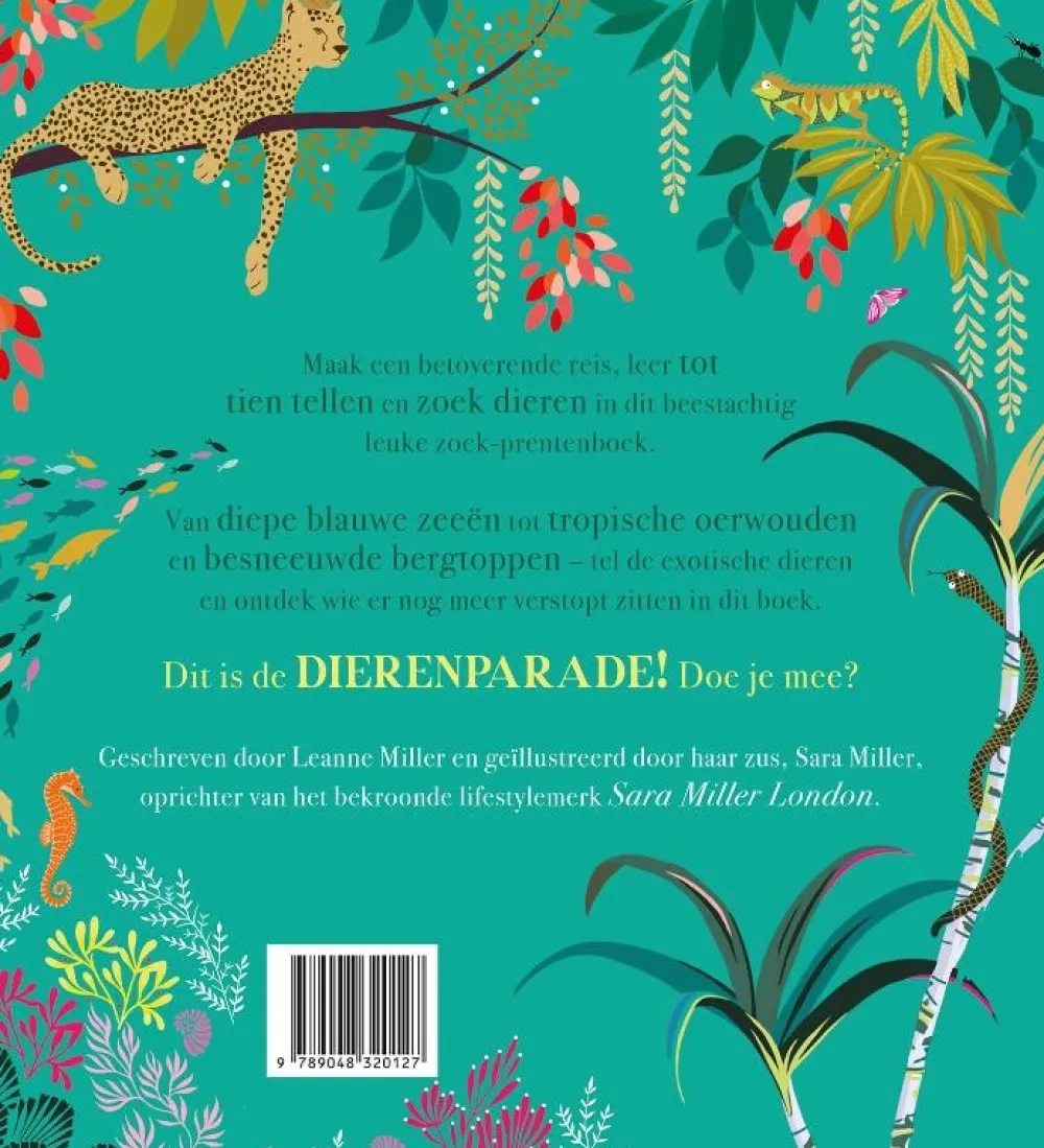 Dit is de DIERENPARADE! Doe je mee? Geschreven door Leanne Miller en geïllustreerd door haar zus, Sara Miller, oprichter van het bekroonde lifestylemerk Sara Miller London.