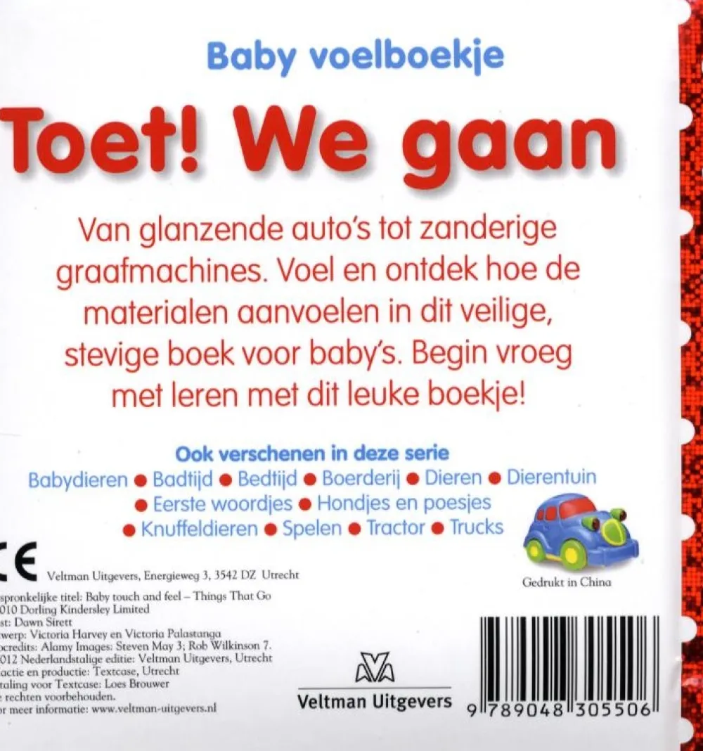 Van glanzende auto's tot zanderige graafmachines. Voel en ontdek hoe de materialen aanvoelen in dit veilige, stevige boek voor baby's. Begin vroeg met leren met dit leuke boekje!