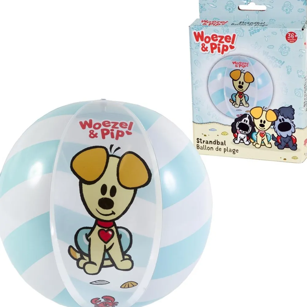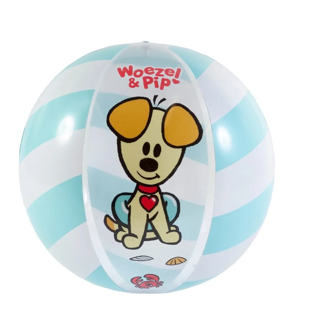Woezel en Pip opblaas strandbal met een doorsnede van 50 cm. Aqua kleurig, met een vrolijk streep dessin en Woezel en Pip printjes. Tevens voorzien van de karakters Charlie en Buurpoes.