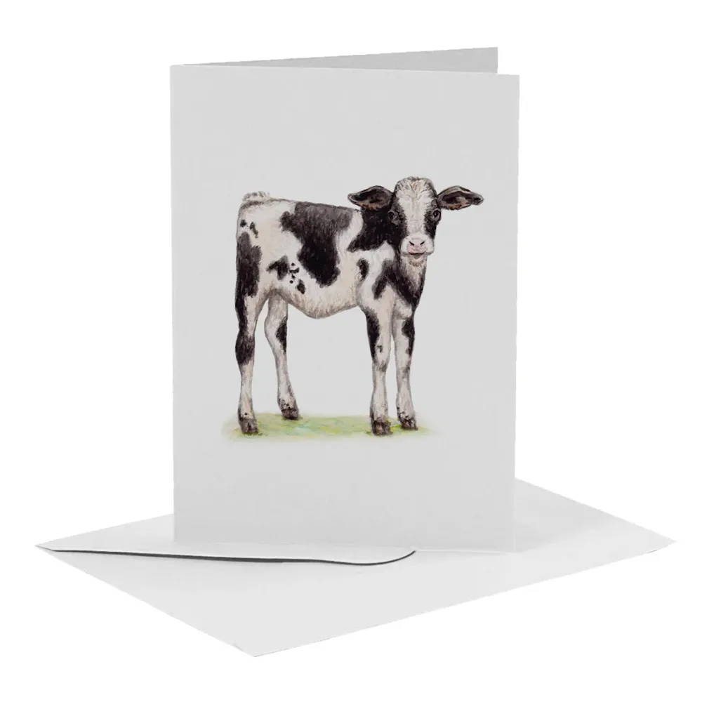 Een blanco wenskaart zonder tekst waarop een kalf is afgebeeld. De schildering is gemaakt door Mies met aquarelverf. De kaart is gevouwen op A6 formaat, gedrukt op 350 grams gebroken wit papier en wordt inclusief witte envelop geleverd.