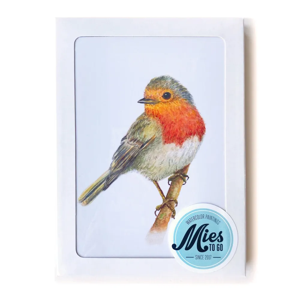 Een blanco wenskaart zonder tekst waarop een roodborstje is afgebeeld. De schildering is gemaakt door Mies met aquarelverf. De kaart is gevouwen op A6 formaat, gedrukt op 350 grams gebroken wit papier en wordt inclusief witte envelop geleverd.